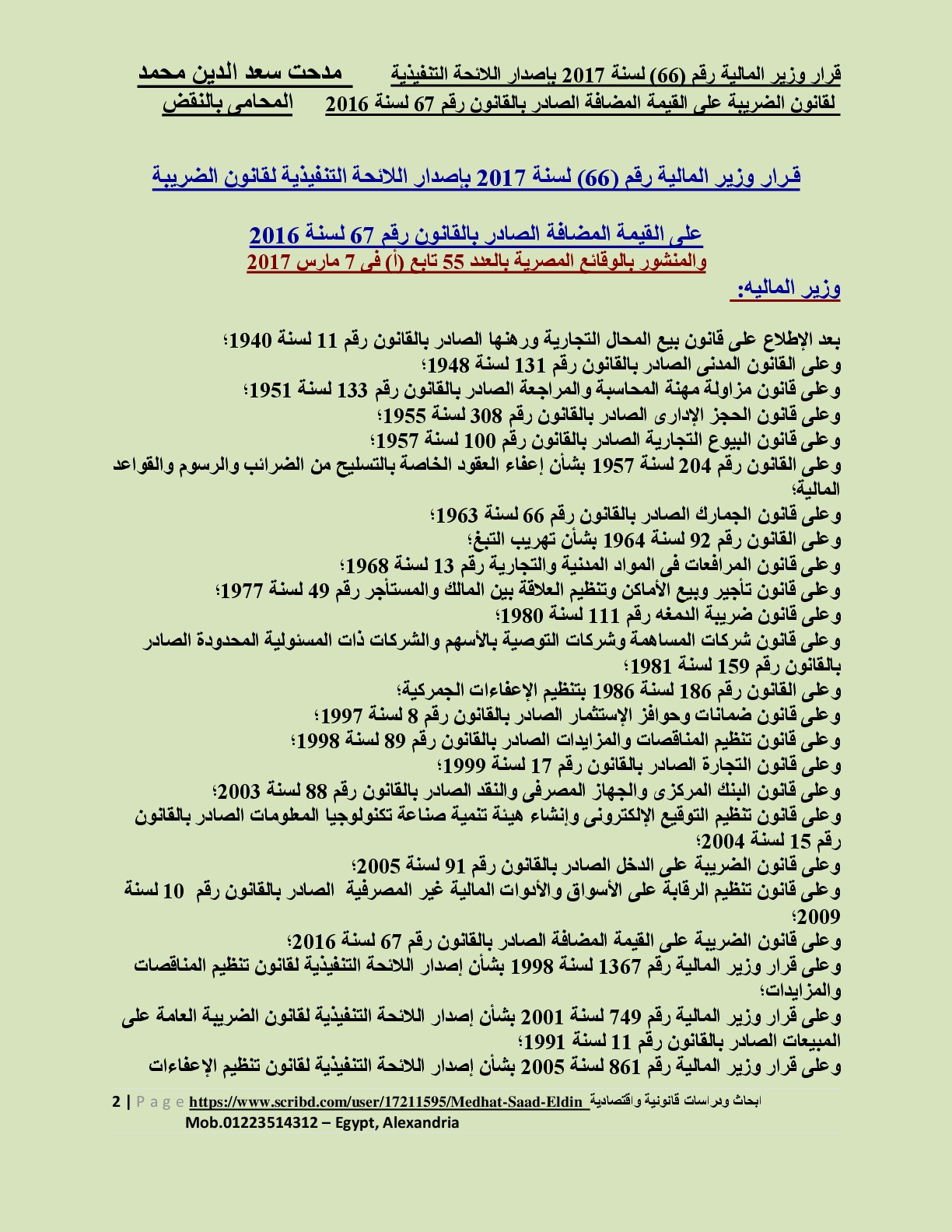 Pdf قـرار وزير المالية رقم 66 لسنة 2017 بإصدار اللائحة التنفيذية لقانون الضريبة على القيمة المضافة الصادر بالقانون رقم 67 لسنة 2016 Medhat Saad Eldin Academia Edu