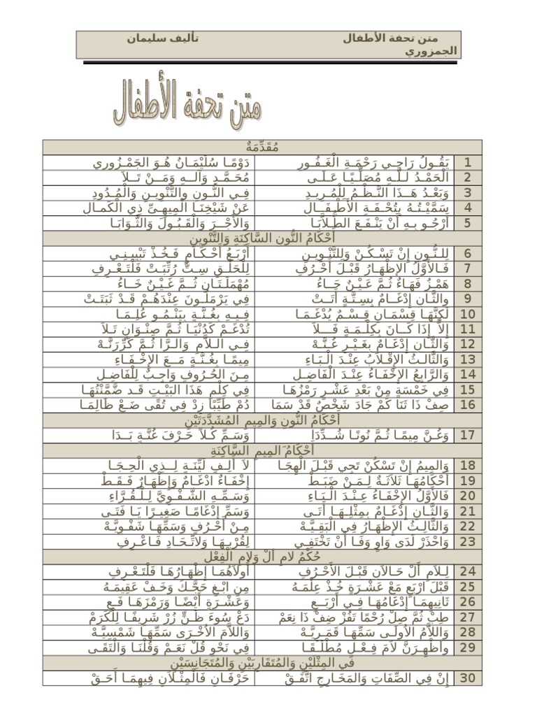 متن تحفة الأطفال word. أضف اقتباس من متن تحفة الأطفال ومتن الجزرية المؤلف الجمزوري الجزري الأقتباس هو النقل الحرفي من المصدر ولا يزيد عن عشرة أسطر. 2013م 1441هـ تحفة الأطفال والغلمان في تجويد كلمات القرآن. ت ح ف ة ال أ ط ف ال و ال غ ل م ان ف ي ت ج و ي د ال ق ر آن. منظومة شعرية في تجويد الكلمات القرآنية اختصت بأحكام النون الساكنة والتنوين والمدود بأسلوب مبسط للطلبة المبتدئين في علم التجويد من تأليف الشيخ.